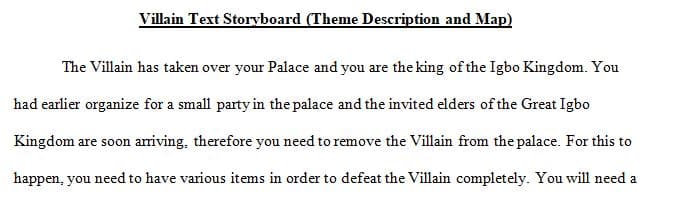 Include a paragraph (if using Word) or a slide (if using PowerPoint) that describes the theme, the basic storyline, the rooms, the items, and the villain. Submit your completed map with the layout of the different rooms and the items in each room. Your map should be on one page of the Word document or one slide of the PowerPoint presentation. You completed these items in Steps #1 and 2.